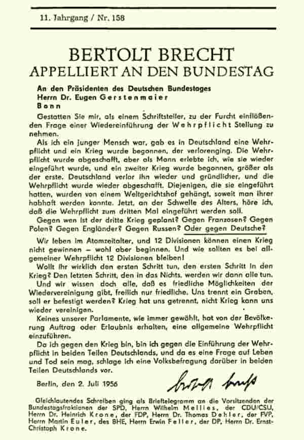 Die DDR-Tageszeitung Neues Deutschland veröffentlichte am 4. Juli 1956 auf ihrer Titelseite anlässlich der 2. Lesung des Rekrutierungsgesetzes einen Appell des großen Dramatikers und Dichters Bertolt Brecht (10. Februar 1898 – 14. August 1956) wider die Einführung der Wehrpflicht.
