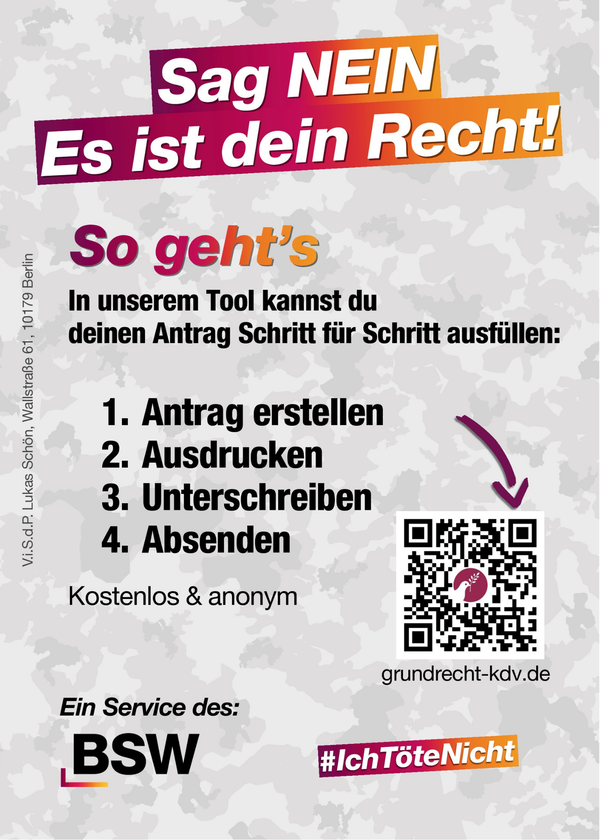 Das BSW-Tool zur Kriegsdienstverweigerung hilft bei der Antragsstellung. Die Anwendung ersetzt keine Rechtsberatung. Sie trifft keine Entscheidung. Und sie nimmt niemandem die persönliche Verantwortung ab. Aber sie hilft, Struktur in einen komplexen Vorgang zu bringen.