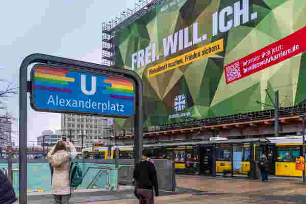Grünbrauner Flecktarn am regenbogenfarbenen Berliner Alexanderplatz: Nach den Schülerprotesten gegen Wehrpflicht und Krieg drängt die Bundeswehr großflächig ins Stadtbild (Foto: IMAGO / Hohlfeld)